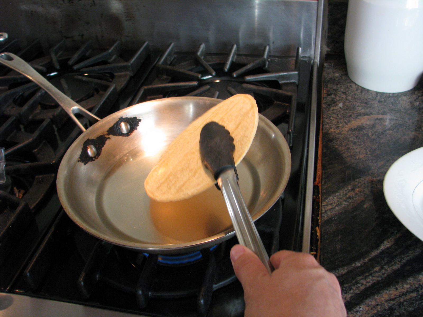 Let them bathe in the oil between 5 and 10 seconds--just until the tortilla is limp and pliable.